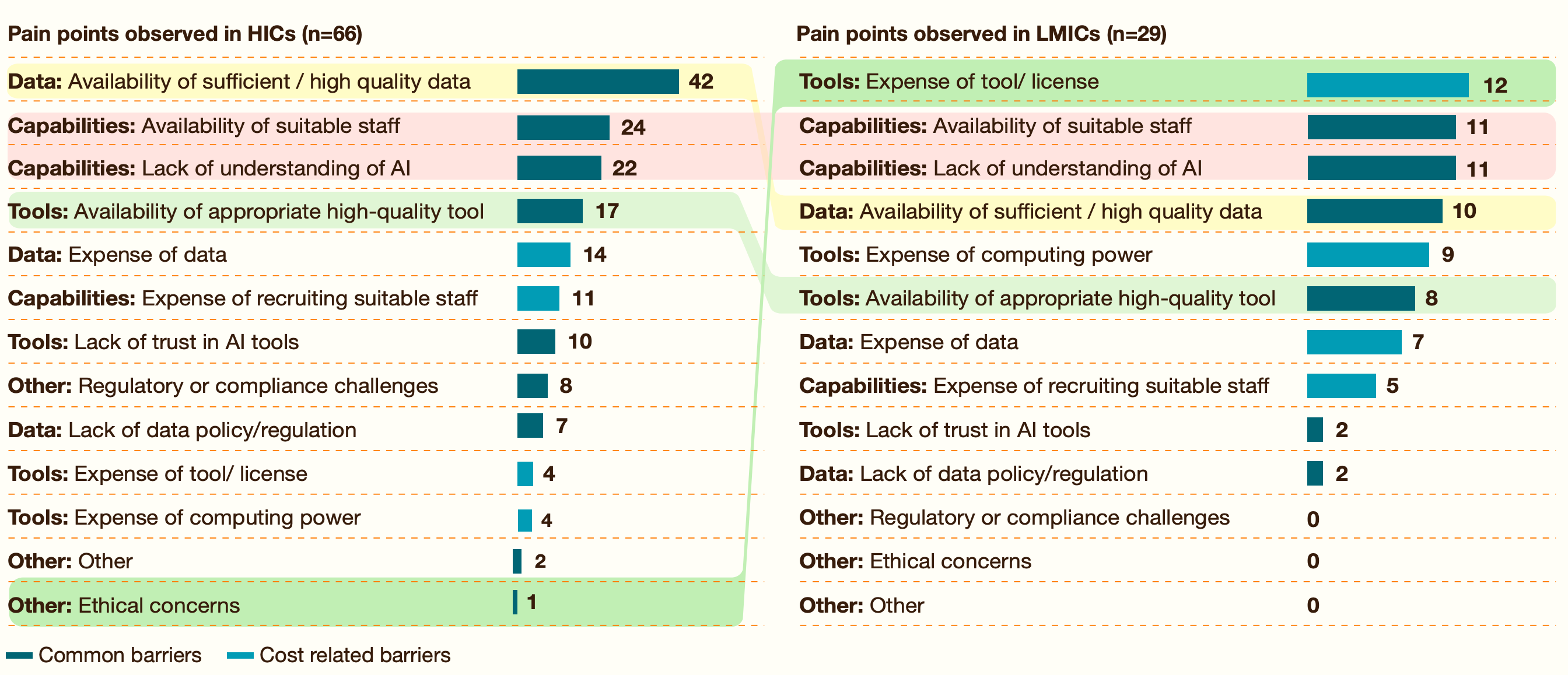 📌 Top pain points are similar between high and low income countries, but in a different order