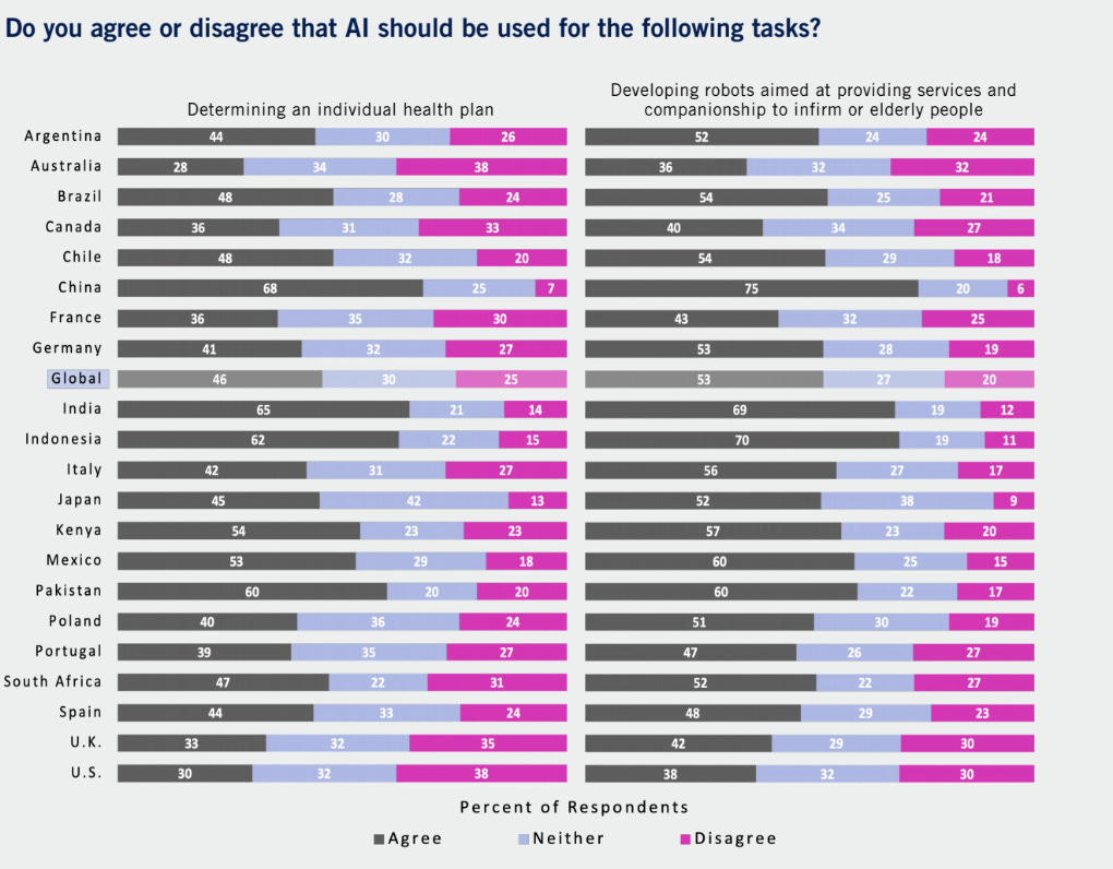 📌 ~50% agree AI use should be used in healthcare, including triage and develop-ing robots aimed at providing services for the elderly.