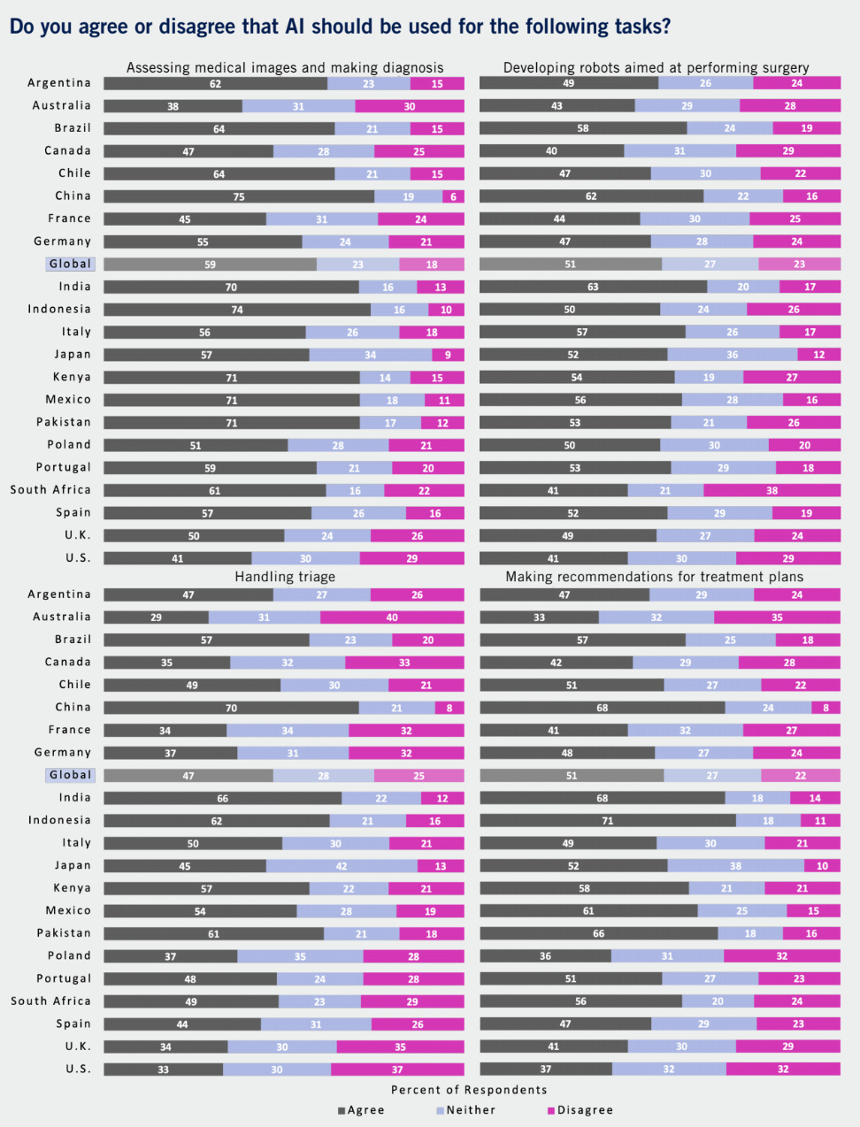 Interestingly, there is a large variability between countries (eg. AI for diagnostic imaging has the widest support, but only 38% of Australians agree with its use compared to 75% of Chinese respondents)
