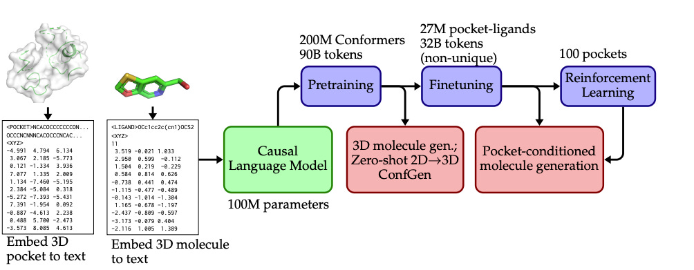 ๐ The magic behind BindGPT is to embed the 3D pocket as text AND applying reinforced learning after the pre-train/fine-tune. Why? To use the knowledge distilled into the model from massive amounts of less structured data.