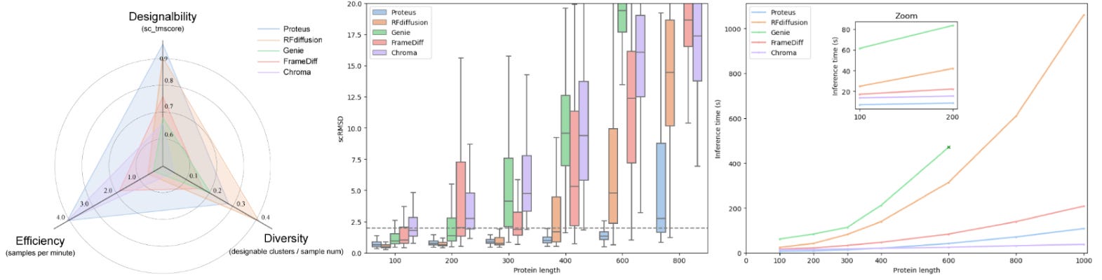 ๐ Proteus shows amazing performance where it can generate a protein of up to 1000 amino acids in less than 3 minutes, compared to other tools like RFdiffusion which takes 8+ hours!