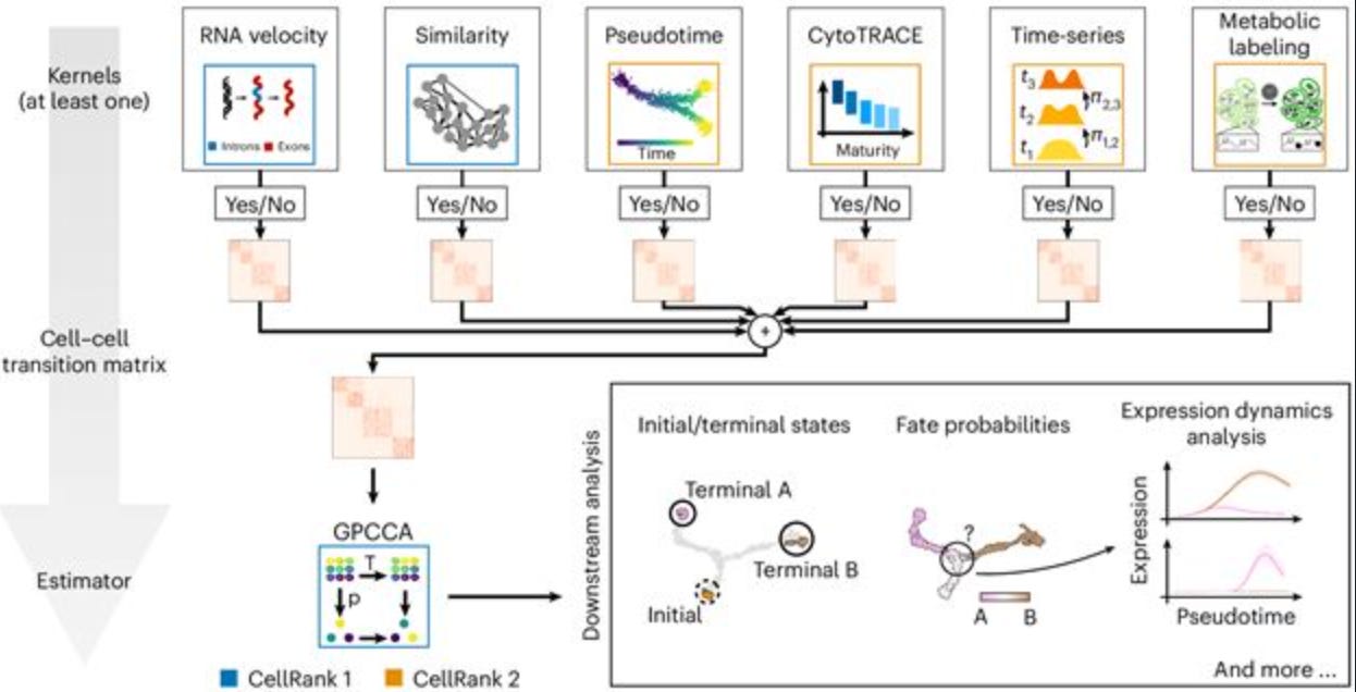 📌 CellRank2 combines multiple modalities (RNA velocity, cell similarity, time-series, metabolic labelling) to predict terminal states and fate probabilities for single cells