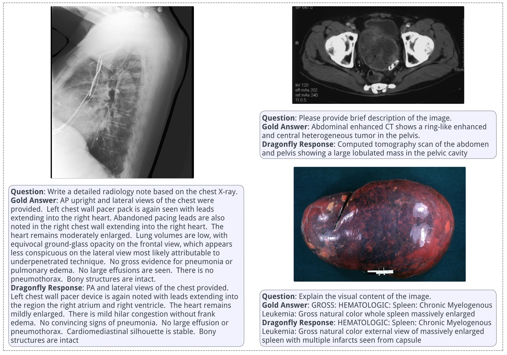 📌 DragonFly also beats state-of-the-art models on a variety of metrics related to image captioning and radiology report generation tasks in the IU X-Ray radiology (3,955 reports and 7,470 frontal and lateral X-ray images) and Peir Gross (7,443 images across 21 pathology sub-categories) datasets