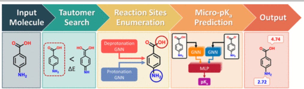 📌 QupKake combines a Quantum mechanics (GFN2 features) with molecular graph neural network (GNN) and was trained on ChEMBL data (∼2.5 million predicted acidic and basic pKa values over ∼1.5 million molecules)