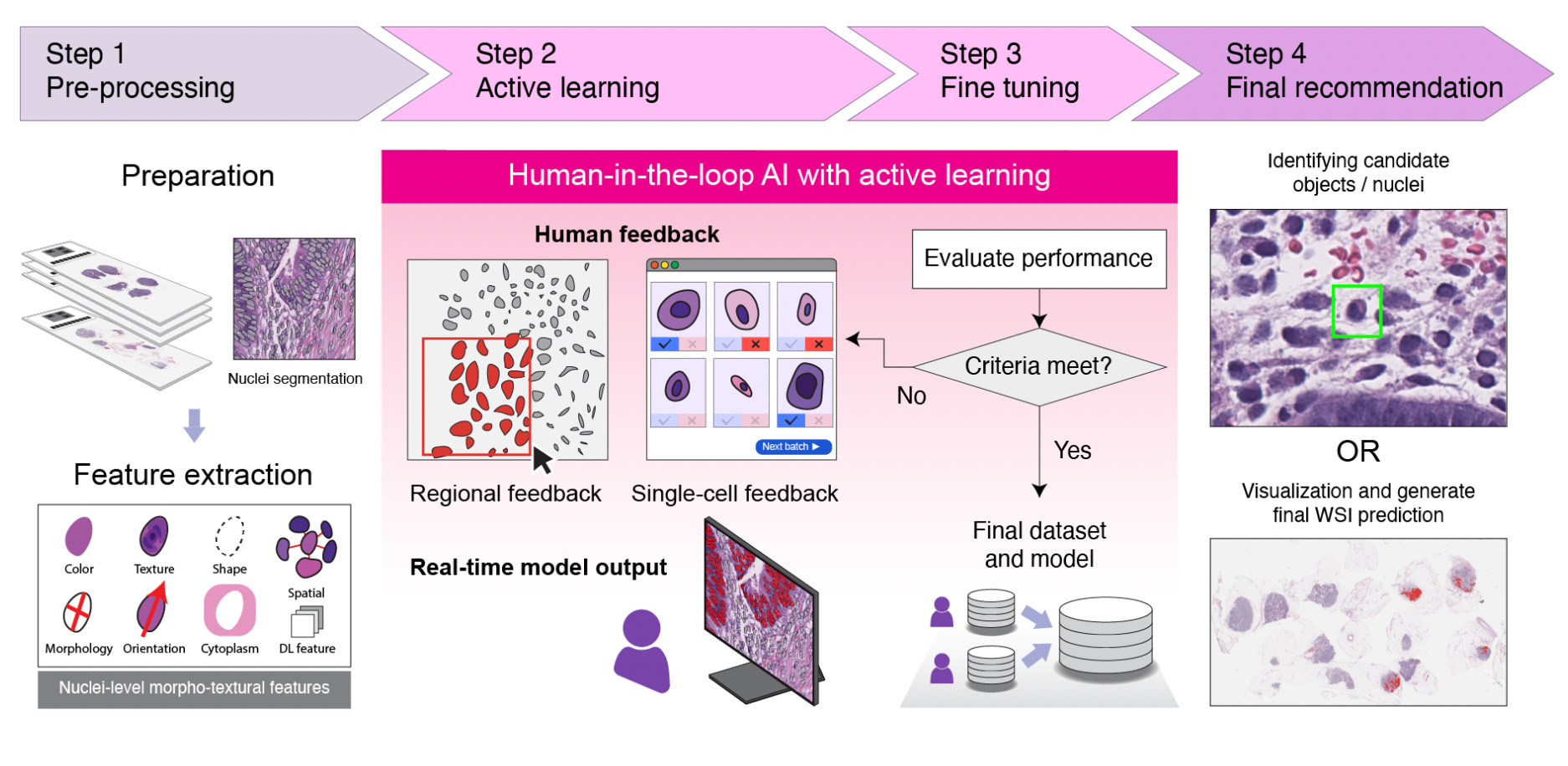 📌 Users can easily select a group of cells and assign to the eg. tumour category, and the tool in real-time will re-color all similar cells in the slide! What’s more, users can in real-time change label more cells as tumour ones and the AI algorithm will re-train and re-color the whole slide