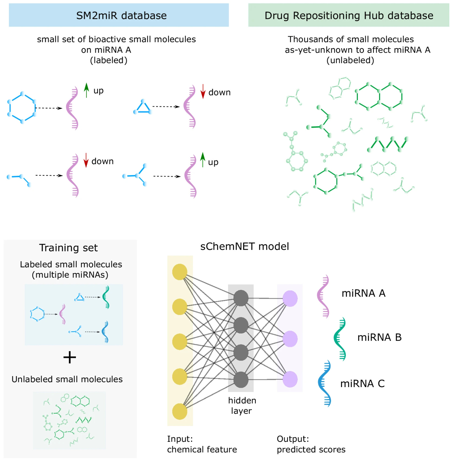MicroRNAs (miRNAs) have been implicated in human disorders, from cancers to infectious diseases. Targeting miRNAs or their target genes with small molecules offers opportunities to modulate disregulated cellular processes linked to diseases. Yet, predicting small molecules associated with miRNAs remains challenging due to the small size of small molecule-miRNA datasets. Introducing sChemNET, one of the first tool to predict how small molecules affect miRNA bioactivity and transcription!