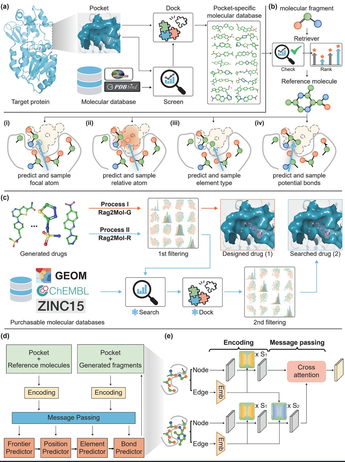 Rag2Mol-G consists of two models, a global retriever to retrieve small molecules from commercial databases that potentially bind to the pocket, and the molecular retriever is to rank and choose the best small molecule for drug design, based on a virtual screening and a docking model.