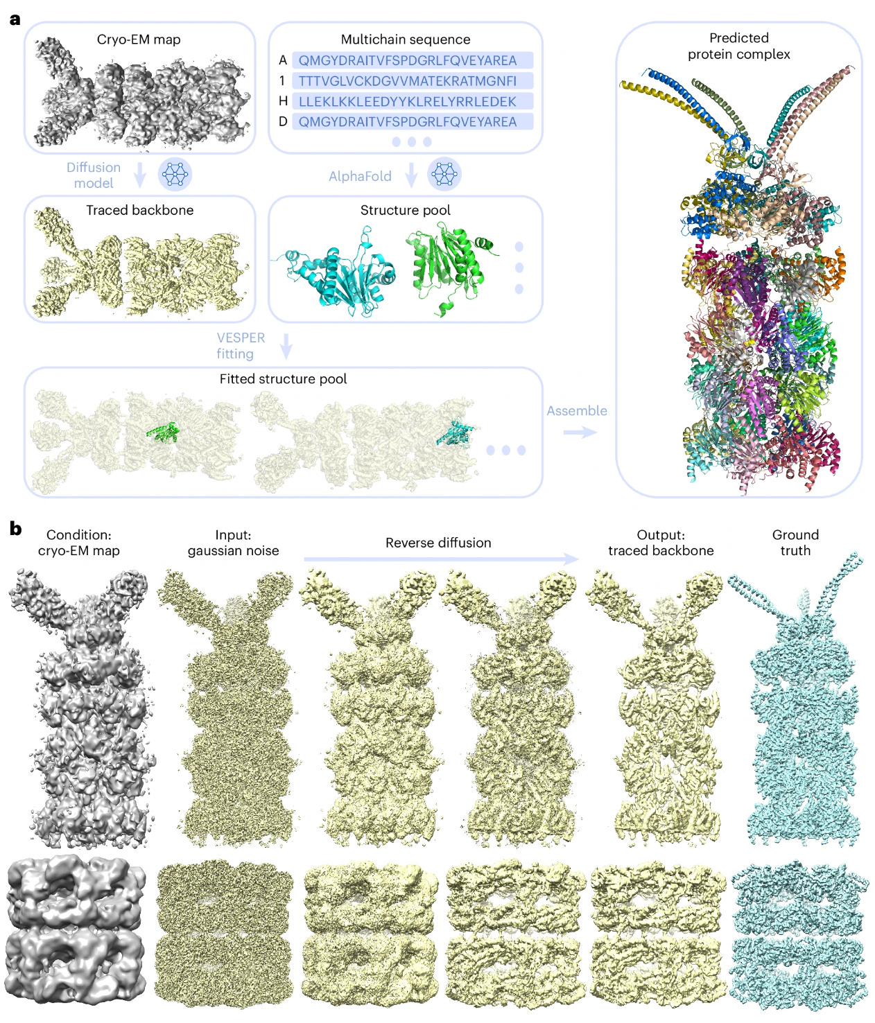 Another week and another model for protein prediction! Today we present DiffModeler, a diffusion model that combines single chain proteins predicted by AlphaFold2 and Cryo-EM data to build full protein complex structures with a high resolution of 0-20A!
