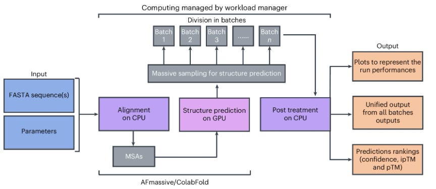 Massive sampling in AlphaFold enables access to increased structural diversity. In combination with its efficient confidence ranking, this unlocks elevated modeling capabilities for monomeric structures and foremost for protein assemblies. However, the approach struggles with GPU cost and data storage. Here we introduce MassiveFold, an optimised and customisable version of AlphaFold that runs predictions in parallel, reducing the computing time from several months to hours. Introducing MassiveFold, a scalable framework able to run on anything from a single computer to a large GPU infrastructure, where it can fully benefit from all the computing nodes.