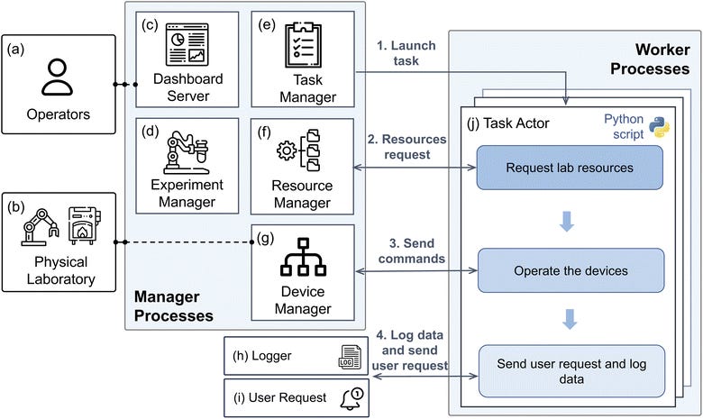 The increasing complexity of autonomous laboratories in science requires sophisticated workflow management to efficiently handle the diverse tasks involved. Introducing AlabOS, a flexible software framework designed to orchestrate and simplify experiments and manage resources efficiently!