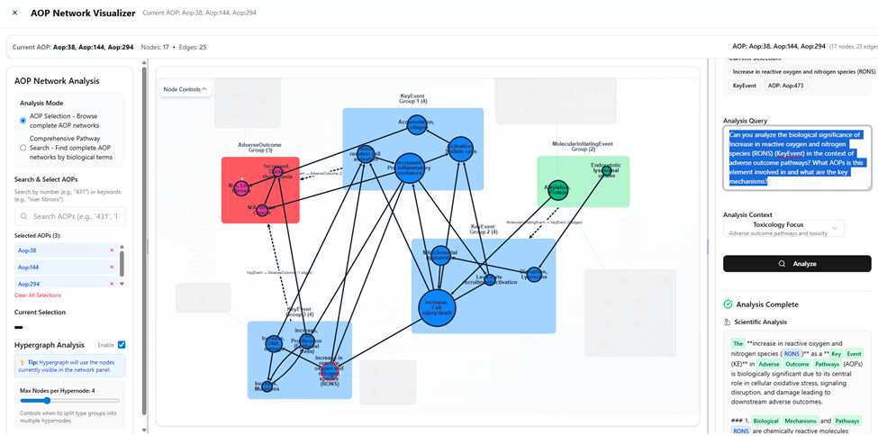 But the real shift comes from its AI analysis panel, which combines the structure of the AOP network with a large language model. When a user selects a node, such as oxidative stress, the AI explains its biological significance, connected diseases, and regulatory relevance in real time.