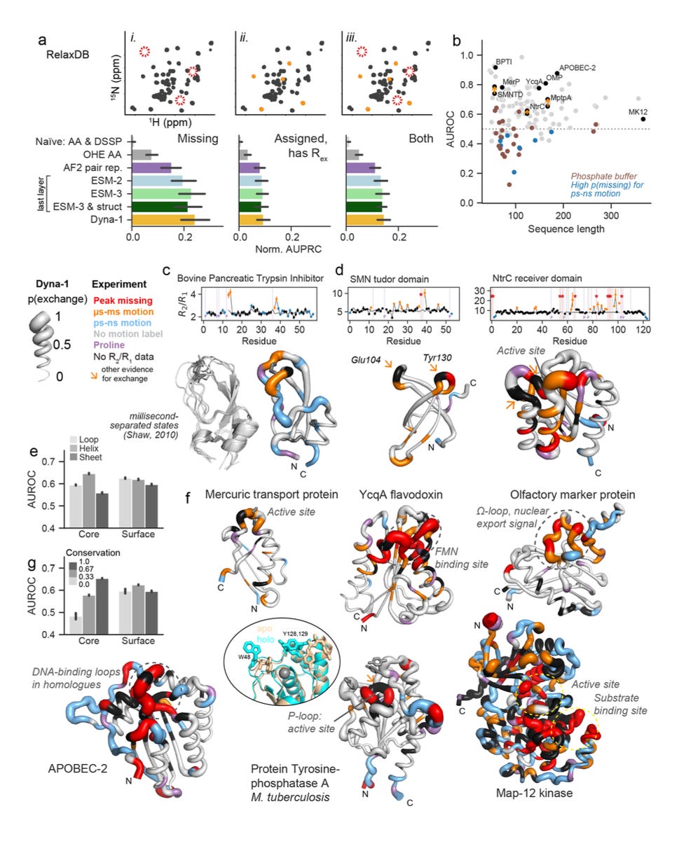 On top of this, they trained a classifier using embeddings from ESM-3, a multimodal protein language model. Their resulting model, Dyna-1, was trained on the missing assignment label, but generalizes beyond this to predict whether a residue undergoes slow dynamics often at biologically relevant sites. They even demonstrated it has predictive power on Rex from CPMG NMR experiments.