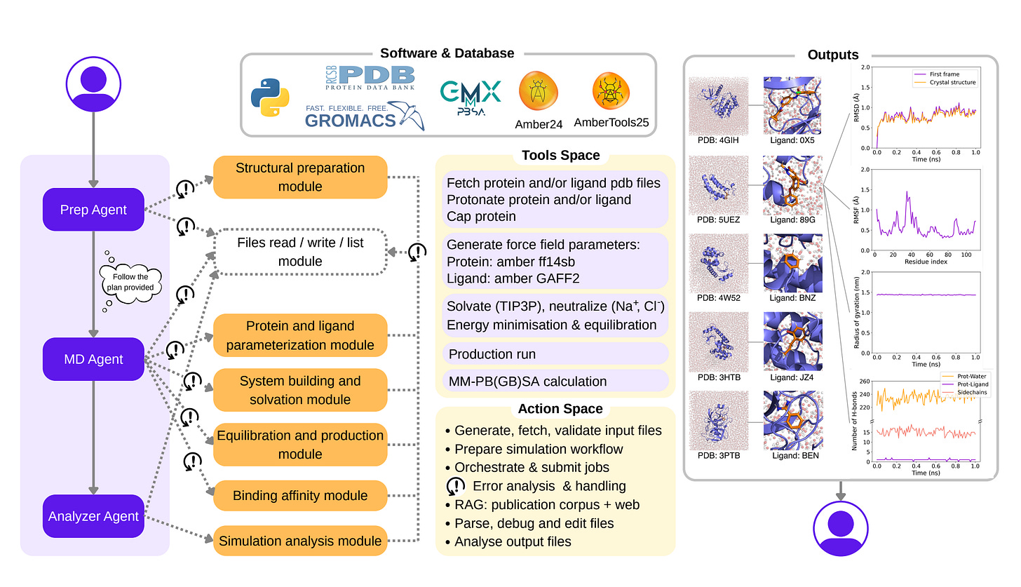 DynaMate, developed by the team at EPFL, is a modular multi-agent system that automates the entire MD workflow. It plans simulations, executes them and analyses results for protein-only and protein–ligand systems, without human input.