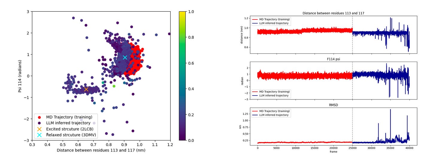 Trained on short MD trajectories from a single conformational state of T4 lysozyme, MD-LLM-1 still discovered the alternative state. From the L99A native state (97 percent population), it generated excited state structures with 113-117 residue distances of 0.5 nm and ψ angles of -0.75 radians, matching the 3% excited state.