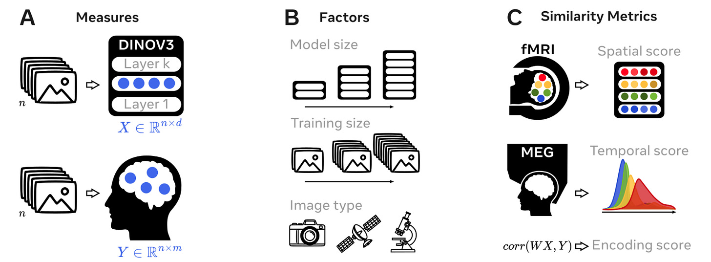 This new study from Meta and ENS-PSL dissects that question by testing how model size, training length, and image type affect how closely a vision transformer (DINOv3) aligns with human brain activity. They compared internal model representations to fMRI and MEG responses from people viewing the same images.