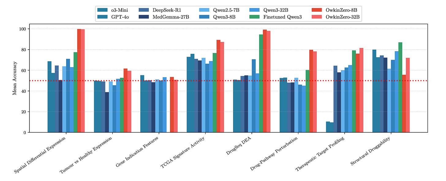 OwkinZero-8B beats GPT-4o, MedGemma, and Qwen3-32B. For example, it scores 94.5% on drug perturbation (vs. 70.5% for Qwen3-8B) and 71.9% on structural druggability (vs. 60–64% for baselines).