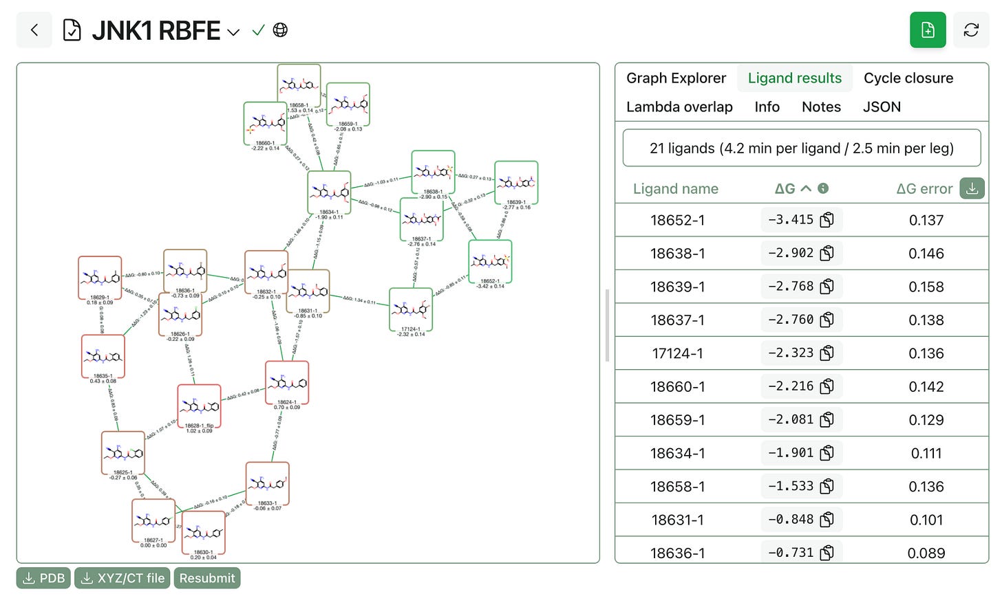 The end-to-end workflow can be run without any coding. Three steps: prepare your poses using analogue docking, build a perturbation graph showing which ligands to compare, and run the FEP calculations on cloud GPUs. Results stream back to your browser in real time.