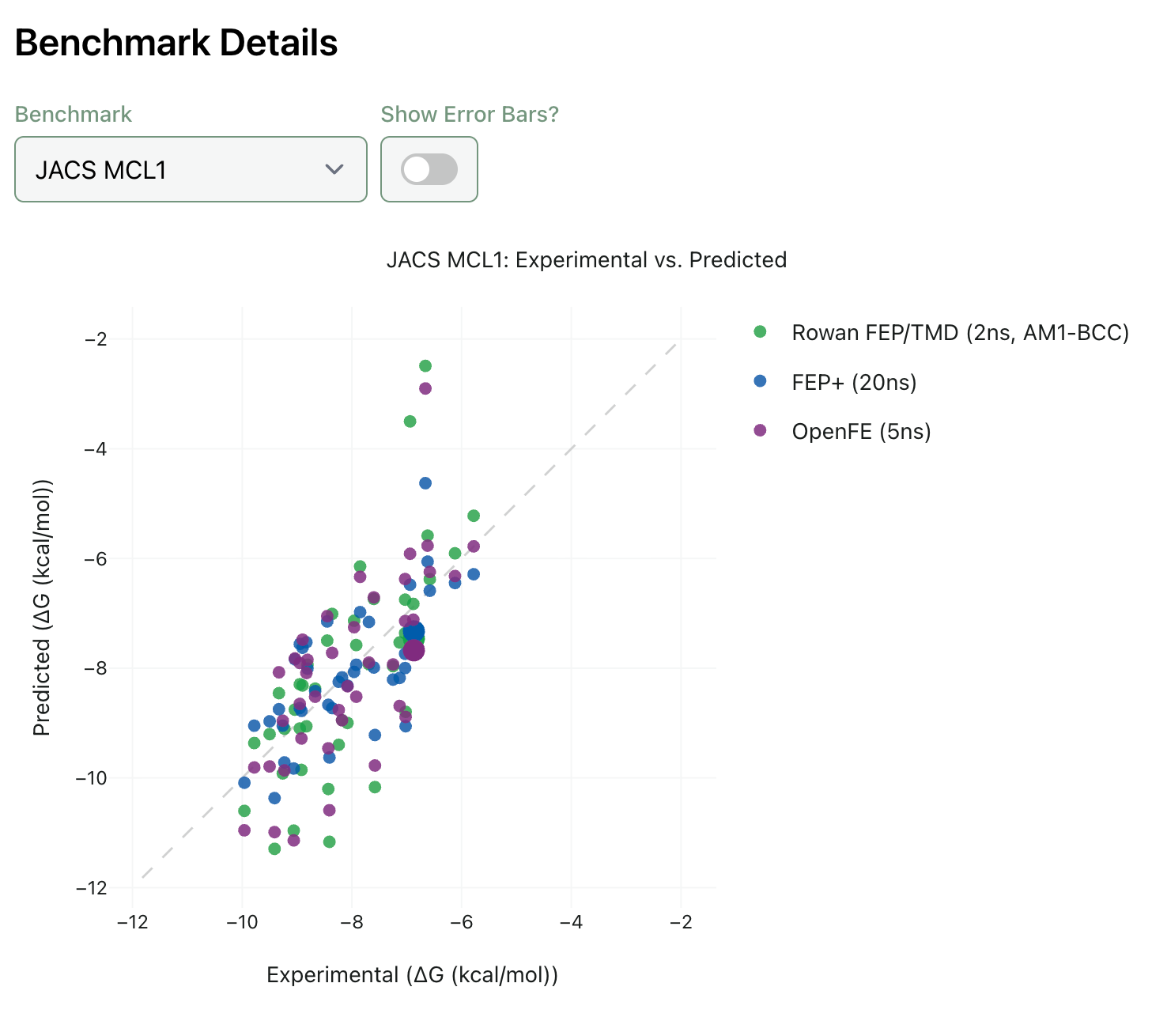 Rowan’s benchmarks show a mean absolute error of approximately 1.3 kcal/mol, compared to Schrödinger’s ~0.8 kcal/mol. The gap comes from two places: the speed-optimising approximations and the use of open force fields rather than Schrödinger’s proprietary ones.