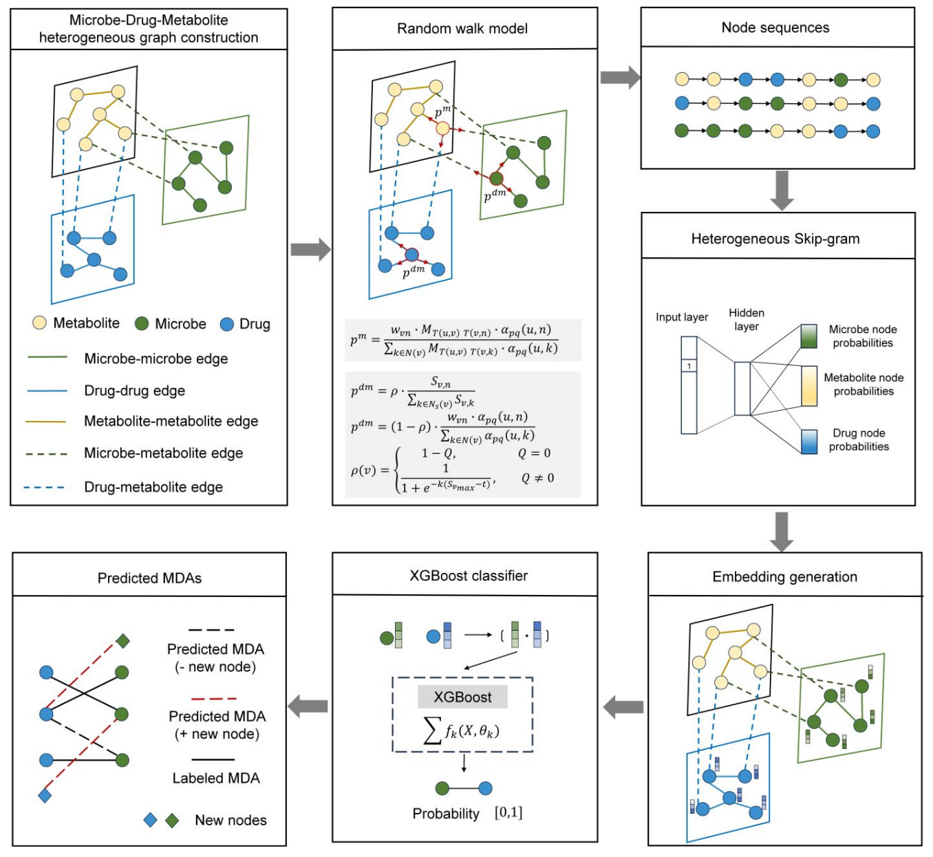 MetaMDA, developed at Shandong University, takes a different approach. It builds a heterogeneous graph of microbes, metabolites and drugs, applies a random-walk model to capture relationships, and uses an XGBoost classifier to generate explainable microbe-drug predictions.
