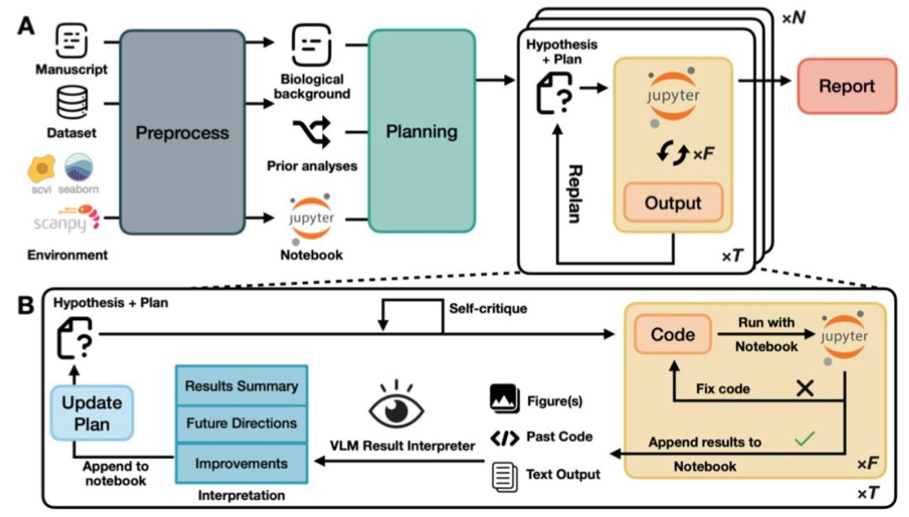 Stanford University’s Zou Lab built CellVoyager on LLMs running within a fixed Jupyter environment. It generates iterative “exploration blueprints” - self-critiqued analytical plans executed step-by-step with automatic code fixing and VLM-based result interpretation.