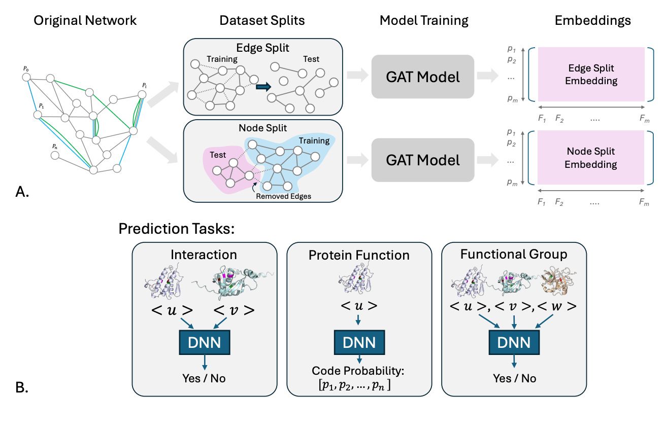 ⚡ The key insight is evaluation design. GATSBI introduces biologically motivated splits: edge splits (testing unseen relationships between known proteins) and node splits (testing entirely unseen proteins with less than 30% sequence identity). Across interaction prediction, function classification, and functional set prediction, GATSBI consistently outperforms PINNACLE, with the largest gains for understudied proteins (AUROC +0.259, AUPRC +0.290 on functional sets).