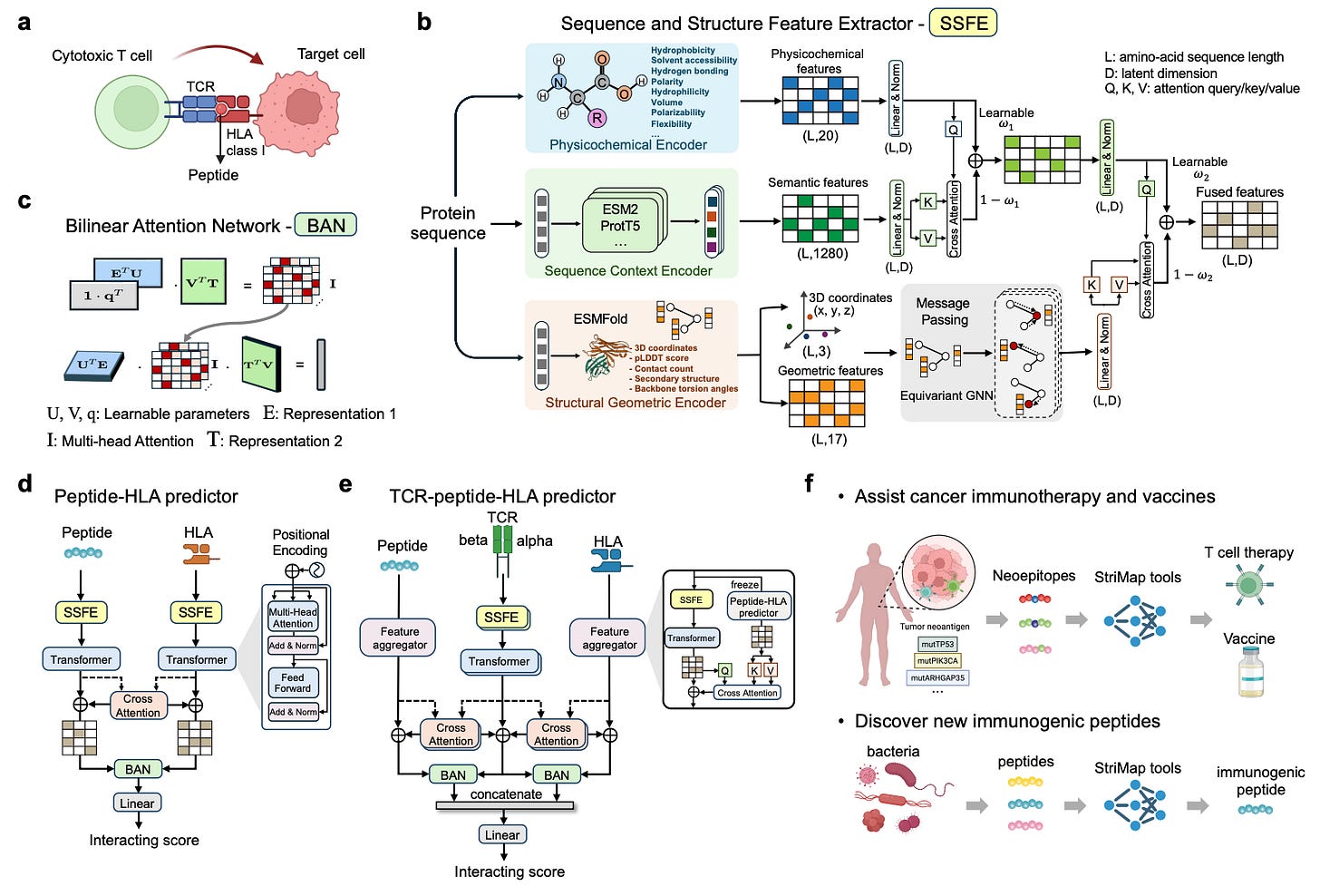StriMap is a unified deep learning framework from the Xavier lab at the Broad Institute and MIT that integrates physicochemical features, sequence context, and structural information at the recognition interface to predict TCR-peptide-HLA binding.