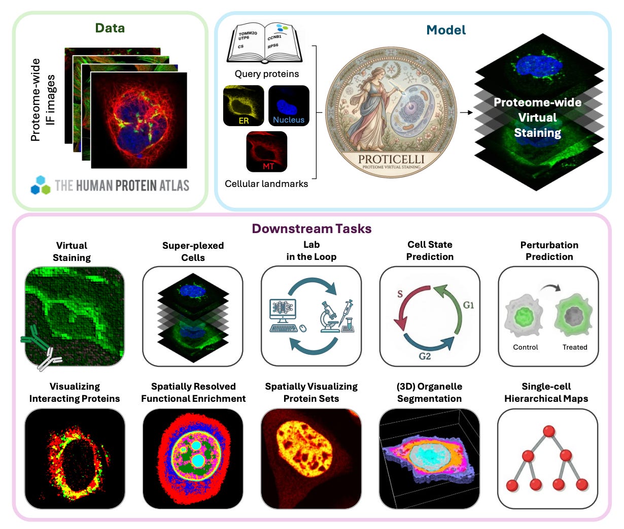 ProtiCelli is a deep generative model from Stanford and KTH, trained on 1.23 million immunofluorescence images from the Human Protein Atlas, that simulates microscopy images for 12,800 human proteins using just three cellular landmark stains as input (nucleus, microtubules, ER).