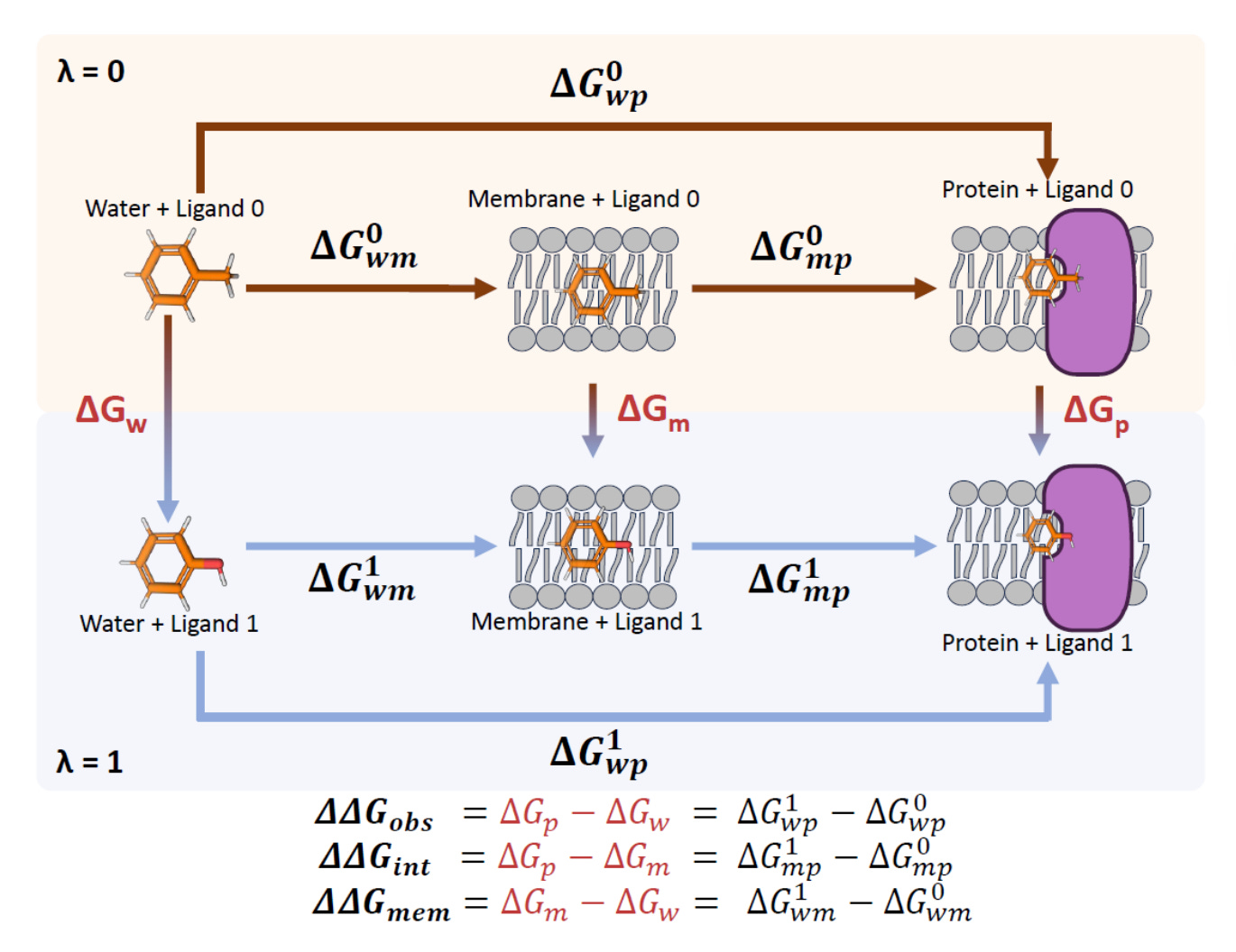NEMAT performs alchemical free-energy calculations in water, membrane and membrane-embedded protein systems, separating membrane partitioning from true protein binding.