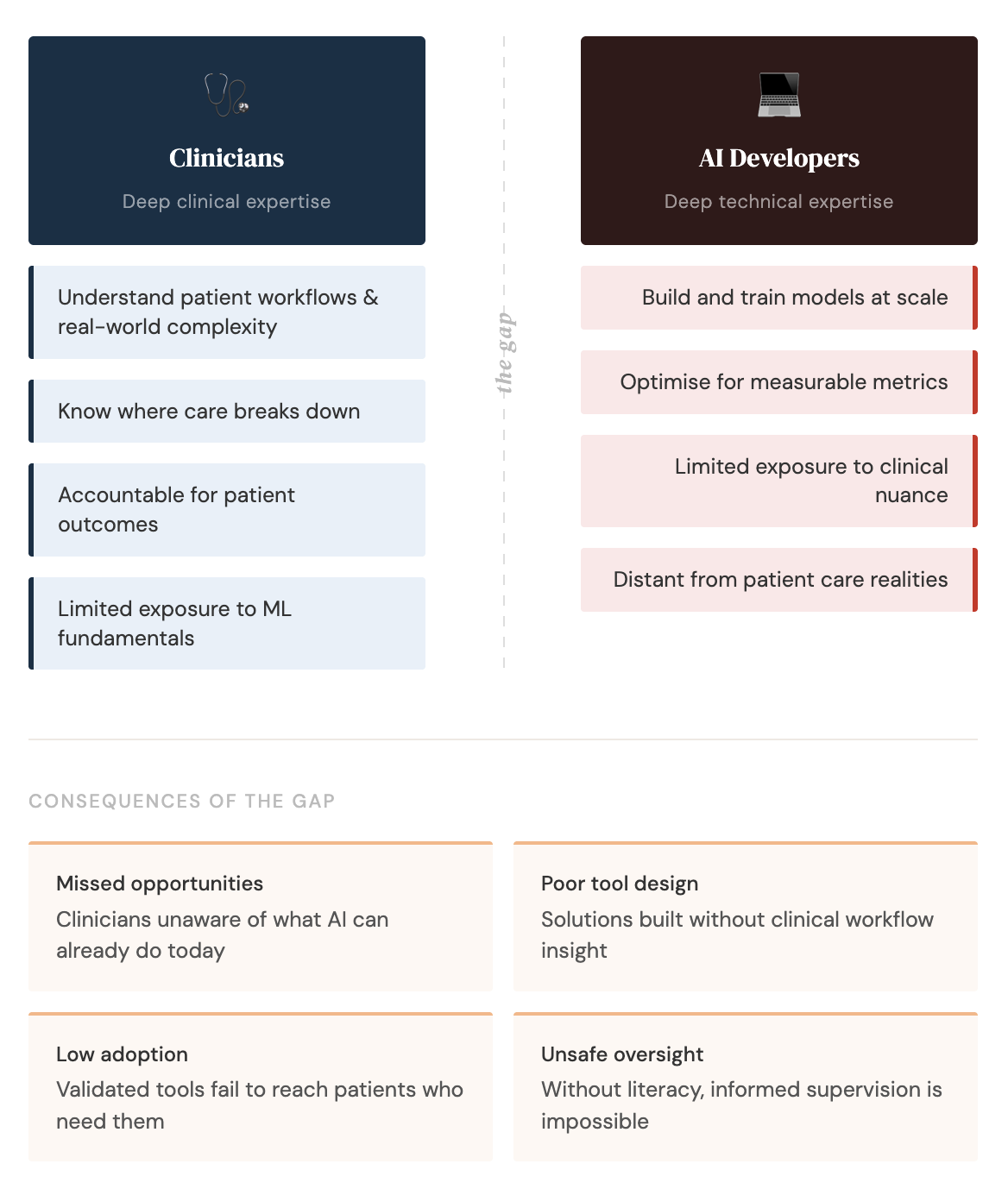 When clinicians participate, their role tends to be more advisory than hands-on, in part because many of the underlying concepts (machine learning fundamentals, deep learning architectures, neural networks, transformers) remain unfamiliar territory. Without a solid understanding of how these systems work, it’s harder to contribute meaningfully to design decisions, evaluation criteria, or safe deployment strategies.