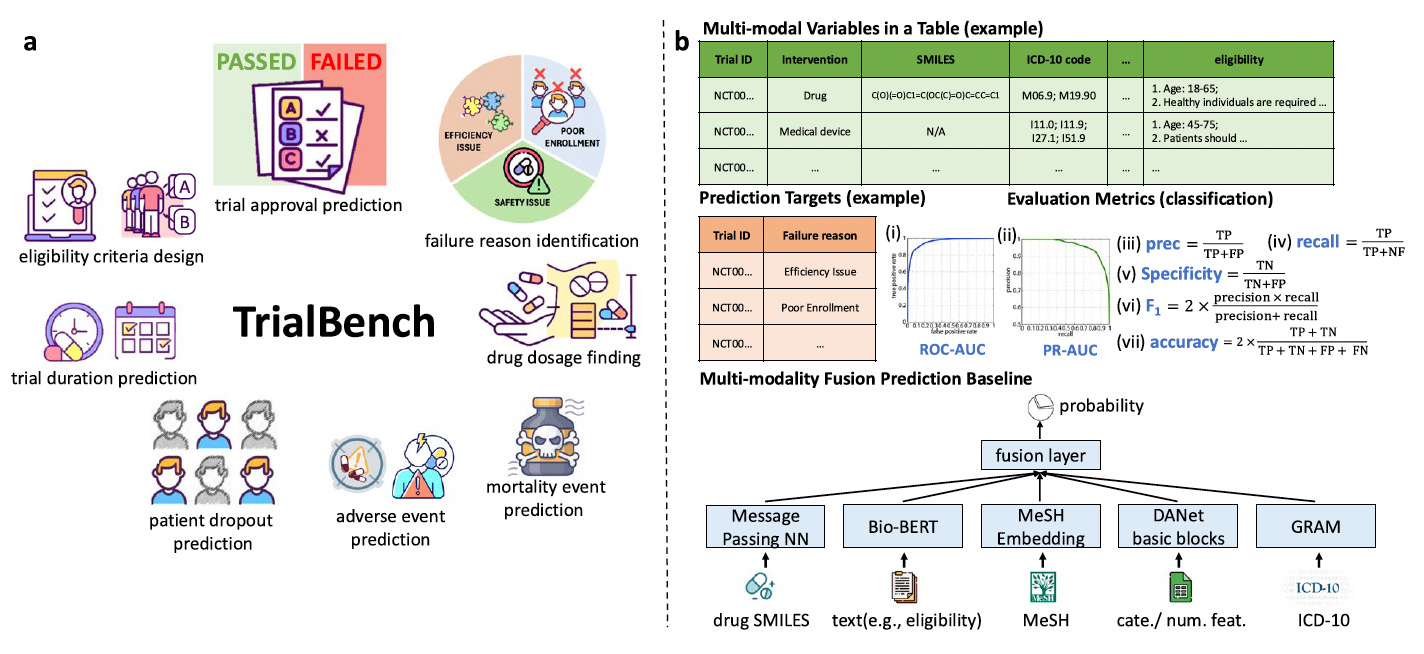 🧬 The eight tasks span the full trial lifecycle: duration, dropout, adverse events, mortality, trial approval, failure reasons, eligibility criteria design, and drug dose finding. Each dataset pairs structured metadata, molecular drug representations, and free-text clinical descriptions, the same mix a human reviewer works with.