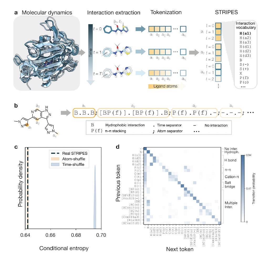 🧬 STRIPES converts interaction fingerprints: hydrogen bonds, hydrophobic contacts, pi-stacking, electrostatics, into compact symbolic strings over time. These form a physically interpretable record of binding, enabling similarity retrieval and conditioning of de novo generation on target interaction profiles.