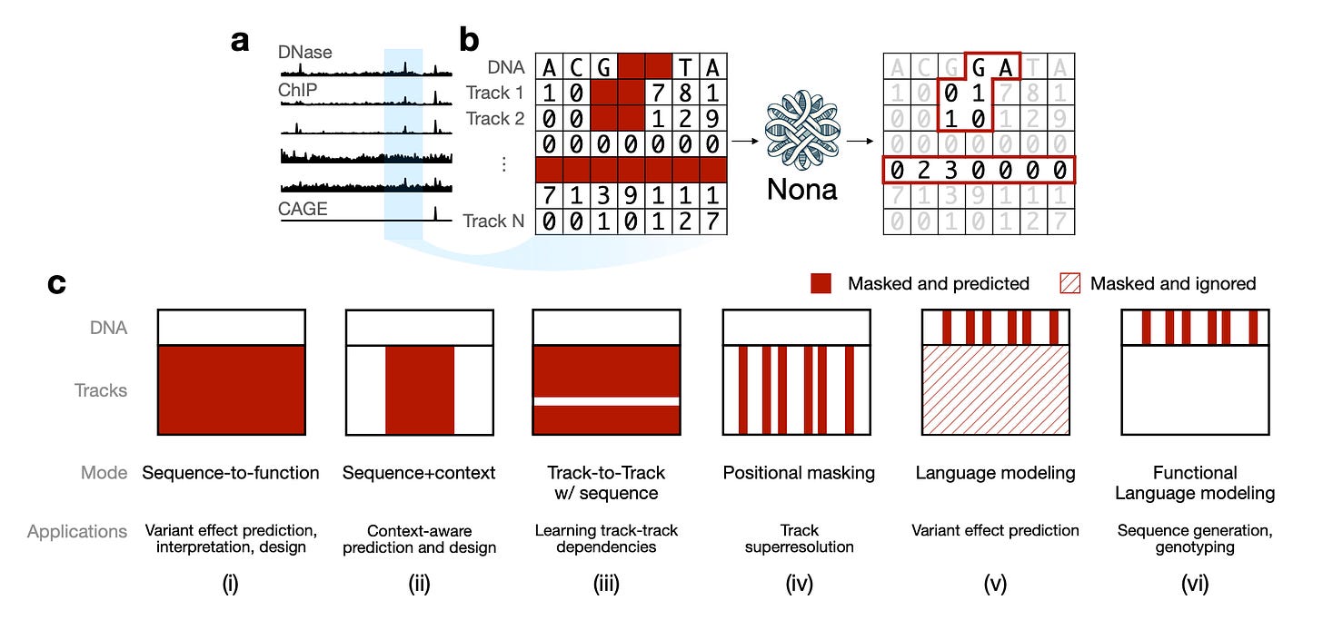 Nona operates on both DNA sequence and base-resolution functional genomics data (such as DNase-seq and CAGE-seq), predicting masked values from unmasked context. Different masking patterns enable everything from variant effect prediction to regulatory element design.