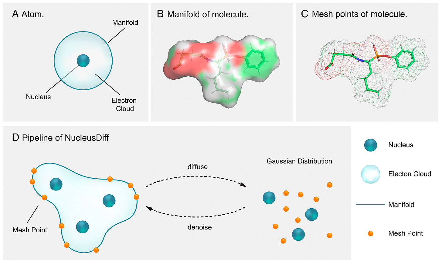 NucleusDiff tackles structure-based drug design by modelling not just atomic nuclei positions, but also the spherical boundary around each atom. By discretising these boundaries into mesh points and enforcing distance constraints during training, the model generates physically plausible molecules that maintain proper atomic spacing while maximising binding affinity to target proteins.
