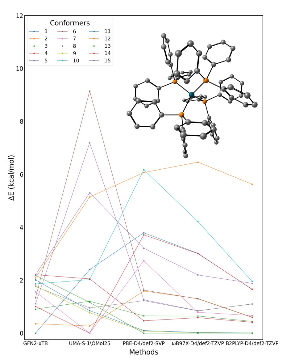 Automatically re-rank conformers using semi-empirical, hybrid, and double-hybrid methods to catch energy shifts missed at lower levels.Spin, redox, and excited-state analysis