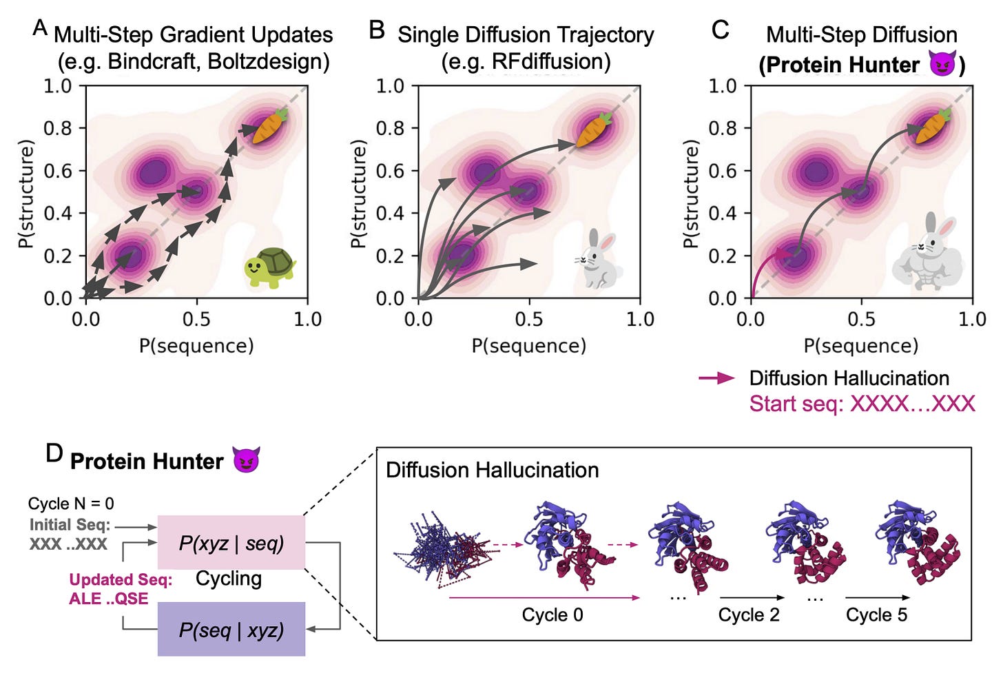 Protein Hunter shows that structure prediction models really can do more than predict; they can actually create. I think this is cool because it switches the narrative of diffusion “hallucination,” once seen as noise, into a design feature. Instead of optimising endlessly, it lets the model imagine structure and sequence together, refining through simple, fast cycles until they converge on something stable.