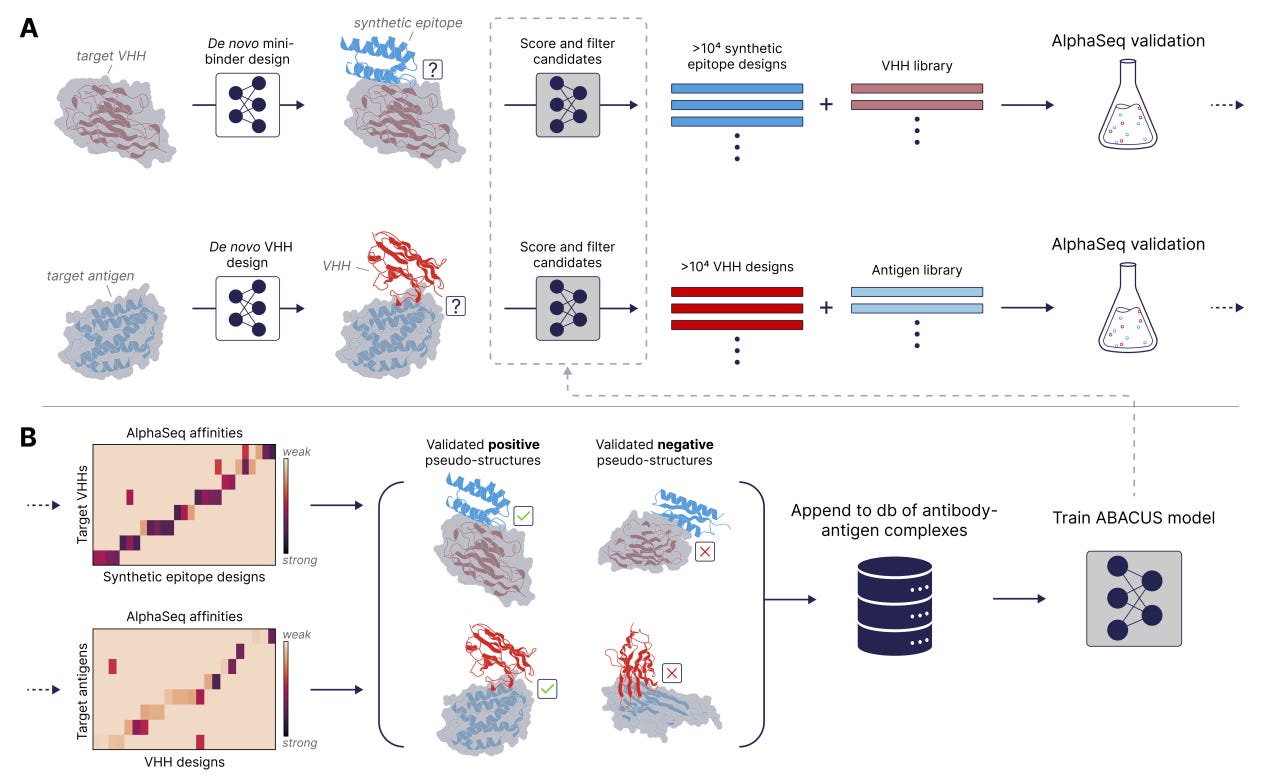 A-Alpha Bio built SEPIA (Synthetic Epitope Atlas), pairing over 26 million on-target and off-target binding measurements with computationally designed VHH-antigen structures. Using their AlphaSeq yeast-based platform, they measured binding affinities and specificity across thousands of de novo synthetic epitope proteins designed to bind VHH nanobodies.
